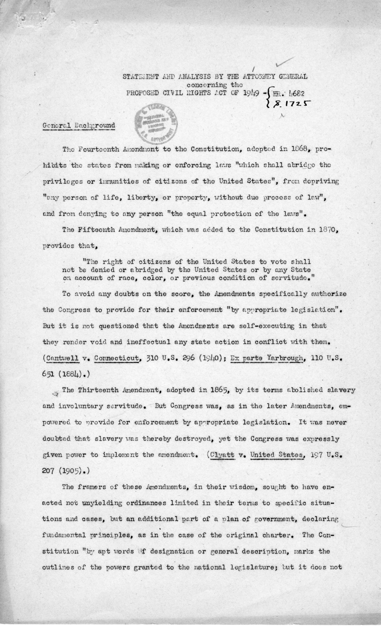 Statement And Analysis By The Attorney General Concerning Proposed Civil Rights Act Of 1949 Hr 4682 S R 1725 Harry S Truman